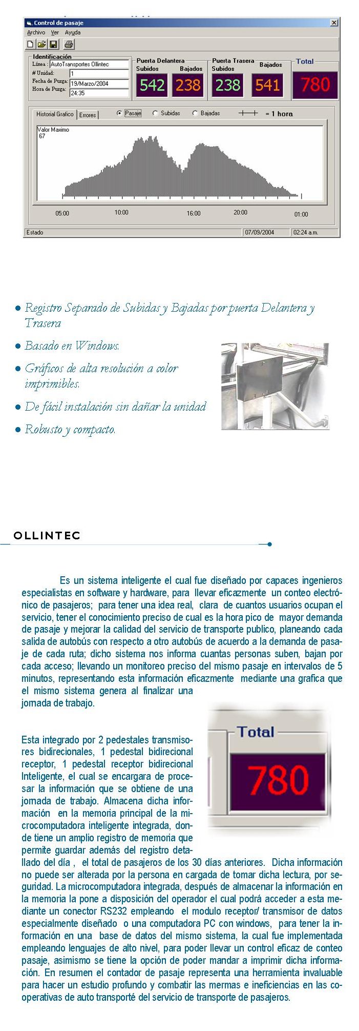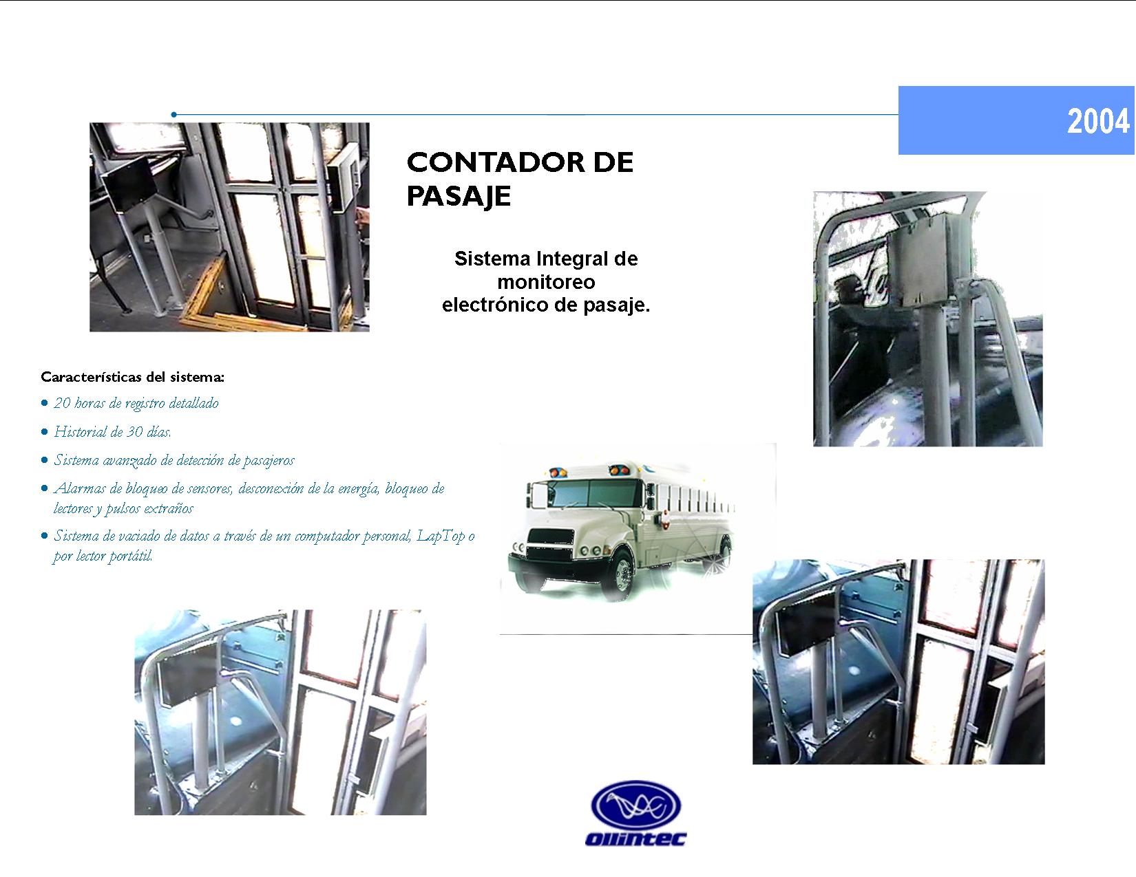 Emplea Microcomputadoras integradas en las bases con algoritmos avanzados de deteccion de paso de personas, que eliminan los falsos conteos asi como las fallas de deteccion del paso de un pasajero.