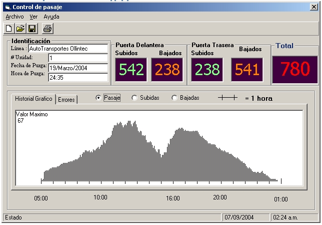 Cuenta el total de pasajeros por jornada de trabajo, asi como las personas subidas y bajadas , tanto por la puerta trasera como por la delantera.